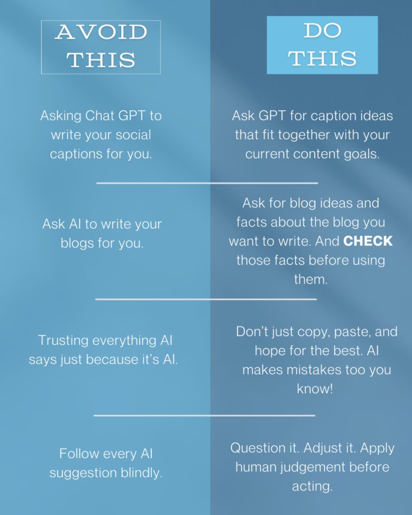 When you rely on it too heavily, a few things tend to happen. Your content starts sounding like everyone else’s. Your personality disappears. You stop thinking strategically about what you’re saying and why you’re saying it. And slowly, without realising it, your marketing loses impact.